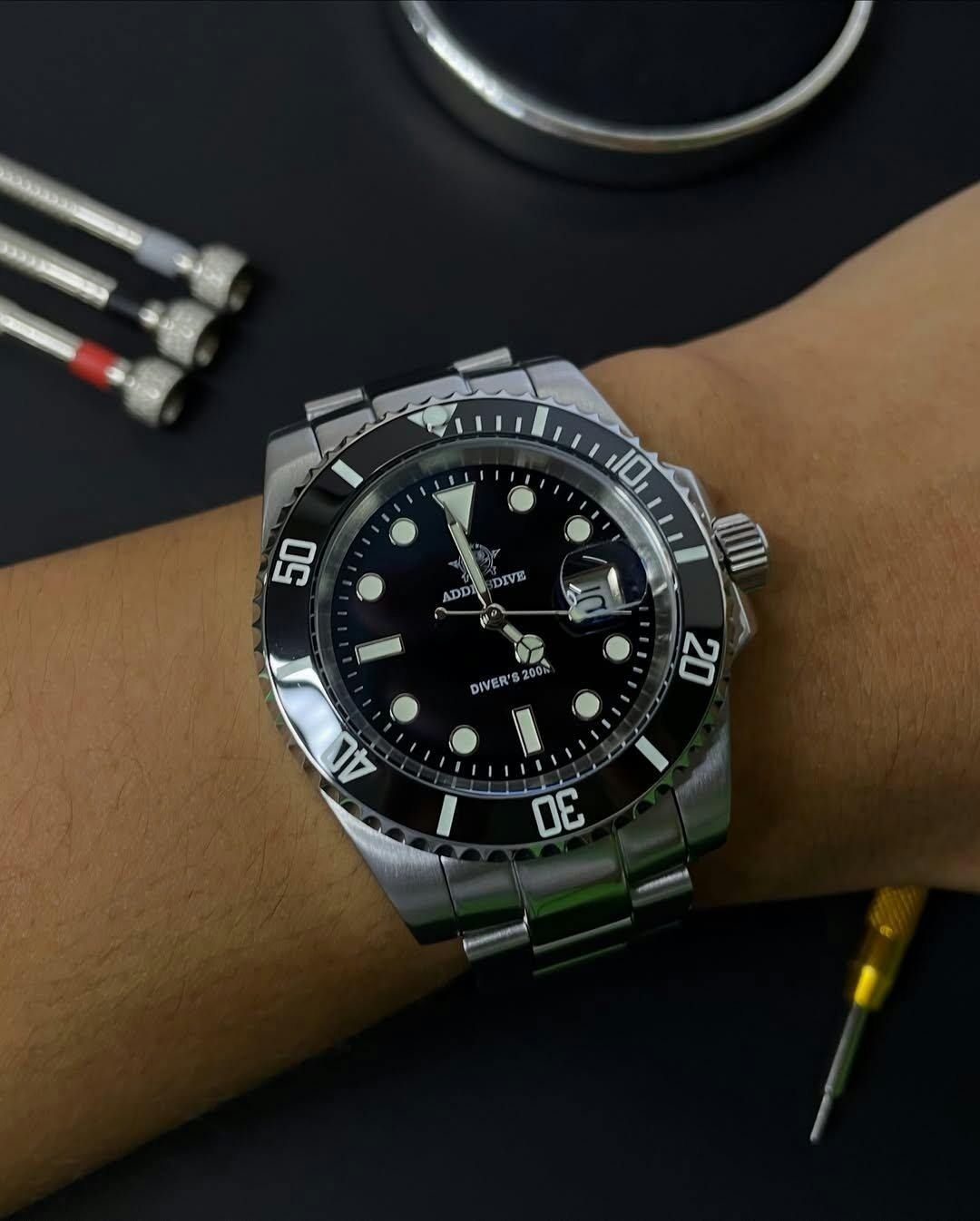 Addiesdive – za muškarce koji znaju šta žele i ne prave kompromise. Crni brojčanik i crna korona stvaraju ozbiljan, fokusiran izgled – sat koji ne traži pažnju, ali jasno pokazuje stav. Savršen izbor za svakodnevno nošenje – od radnog dana do večernjeg izlaska.