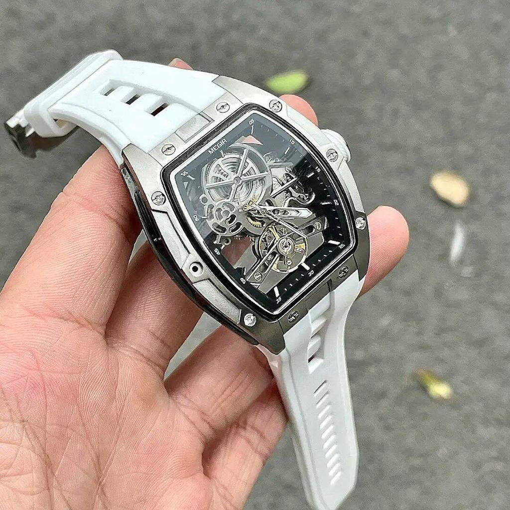 Megir MN22 je namenjen muškarcima koji traže sat sa skeleton dizajnom, pouzdanim mehanizmom i upečatljivim izgledom koji se lako uklapa u savremeni stil. Crni brojčanik sa istaknutim srebrnim kućištem i belim kaišem, stvara jak vizuelni kontrast i naglašava moderan, sportsko-elegantan karakter ovog modela.