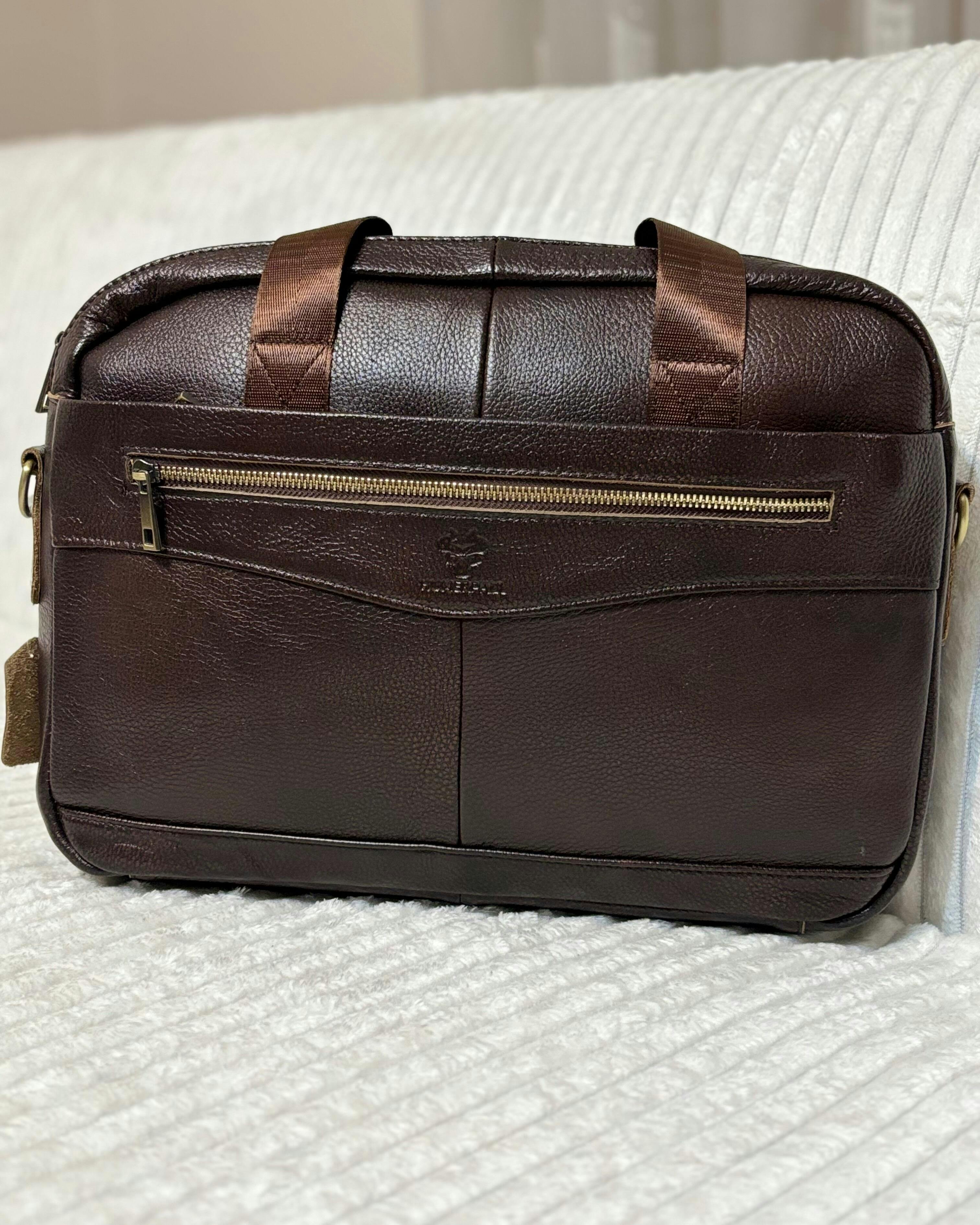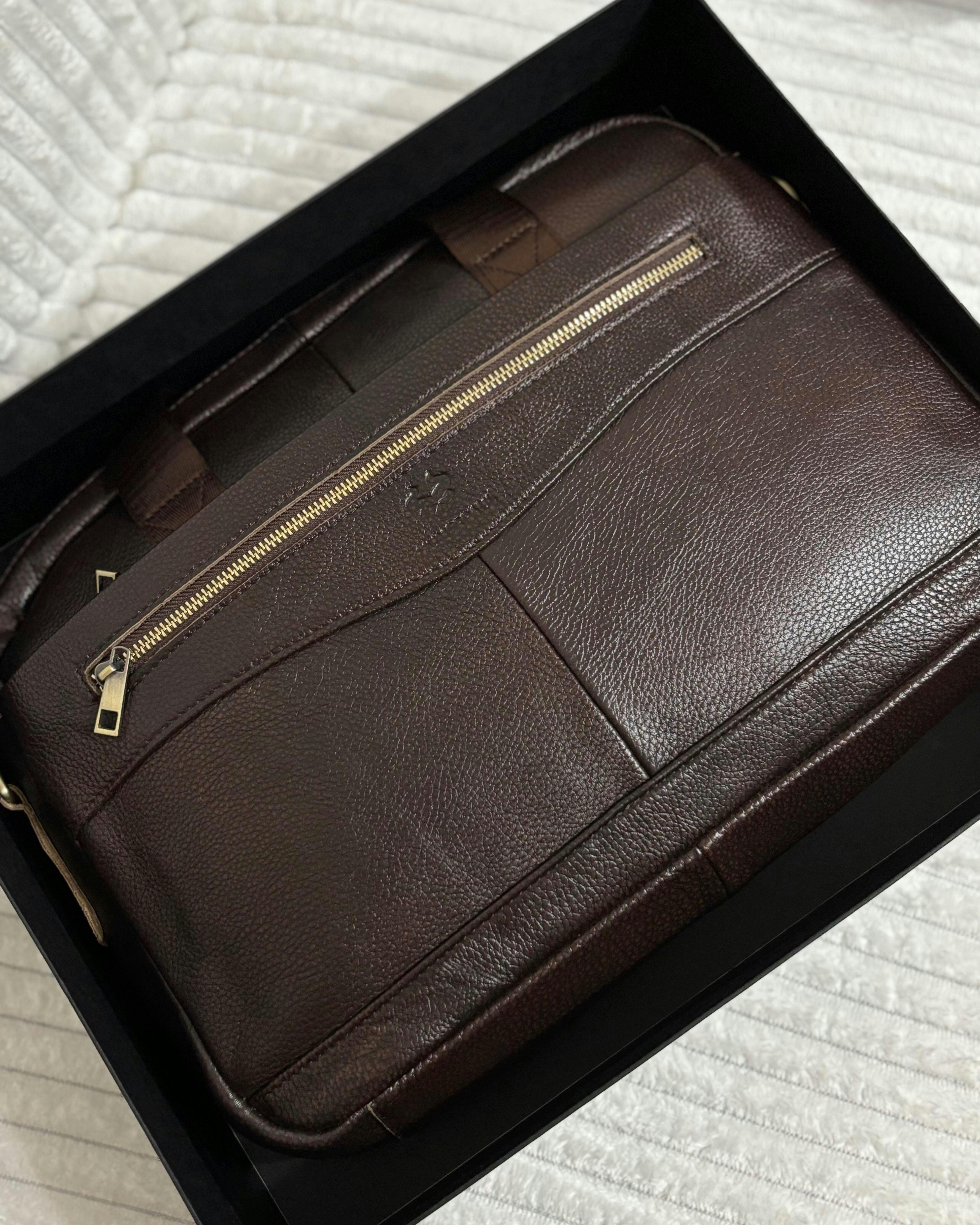 Kožna torba HUMERPAUL u tamno braon boji osmišljen je za muškarce koji dan započinju sastankom, nastavljaju obavezama po gradu i završavaju ga u kafani. Uređena, izdržljiva i vizuelno upečatljiva, ova torba prati Vaš ritam.