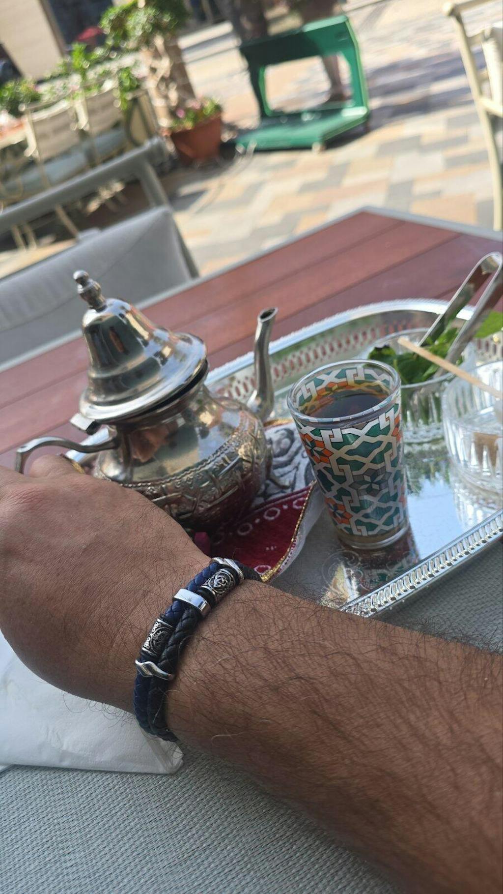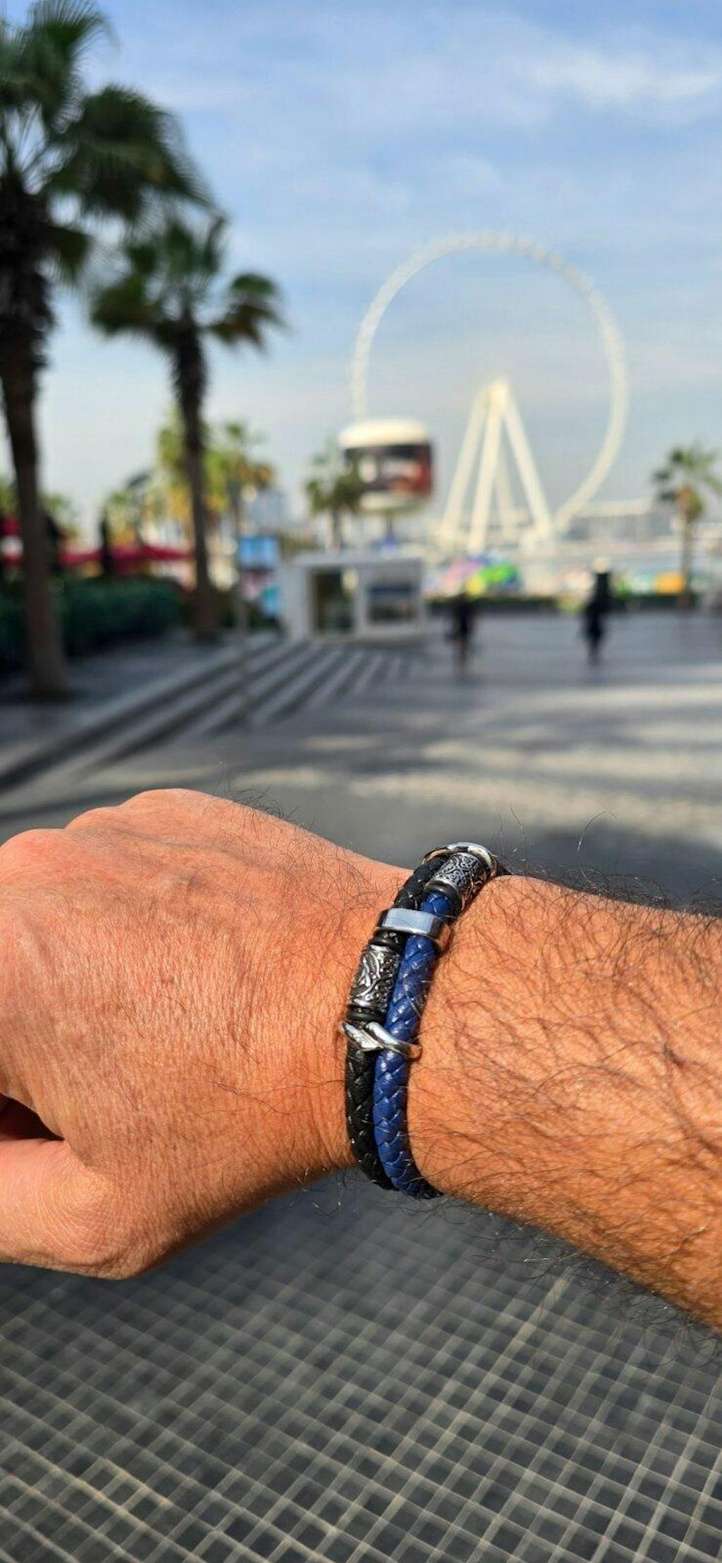 ✅ Pletena prava koža u crnoj i plavoj boji pruža udobnost, fleksibilnost i dugotrajnost, uz vizuelni balans između snage i smirenosti.