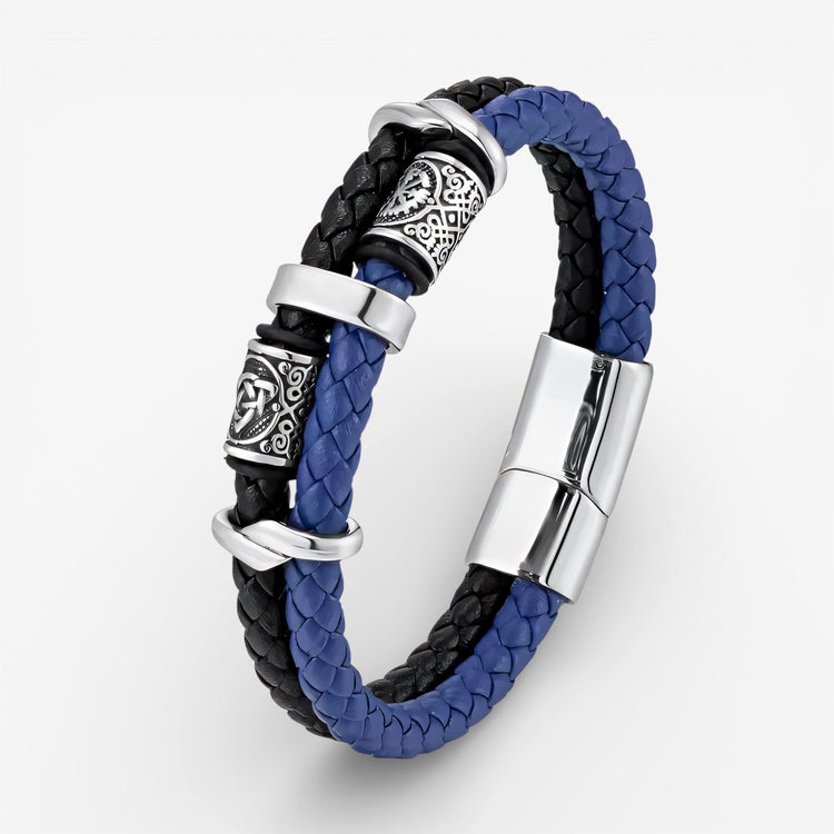 ✅ Pletena prava koža u crnoj i plavoj boji pruža udobnost, fleksibilnost i dugotrajnost, uz vizuelni balans između snage i smirenosti.