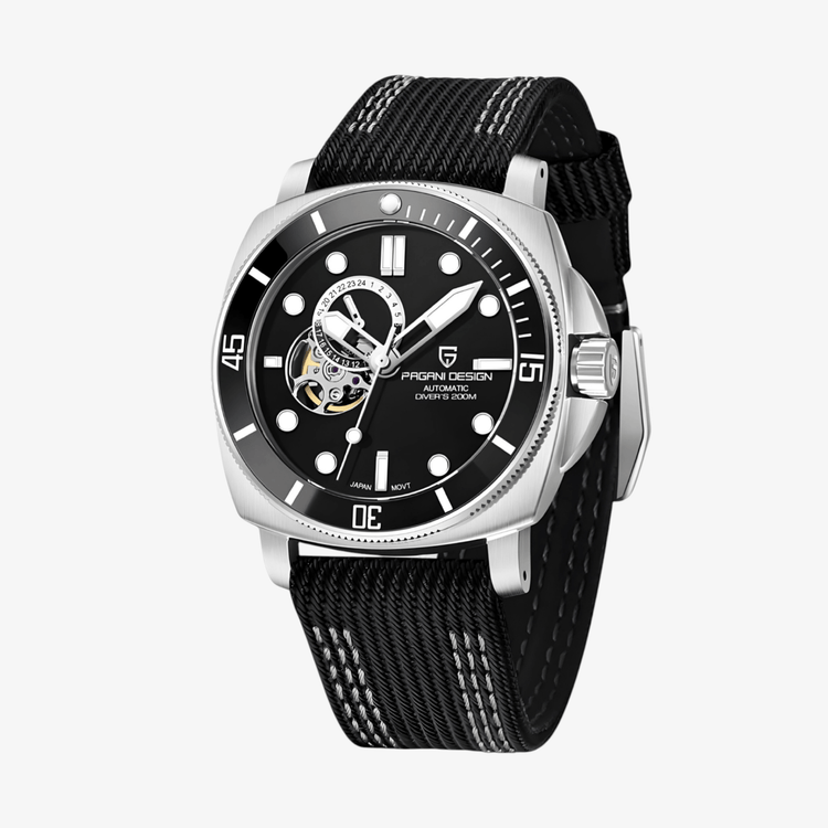 Pagani Design PD1736 – izbor za muškarce koji ne pristaju na kompromis. Preciznost automatskog mehanizma i upečatljiv izgled spojeni u jednom modelu. Otvoreni brojčanik otkriva proveren Seiko NH39 automatik, dok crna NATO narukvica naglašava sportski karakter i donosi komfor kroz ceo dan.