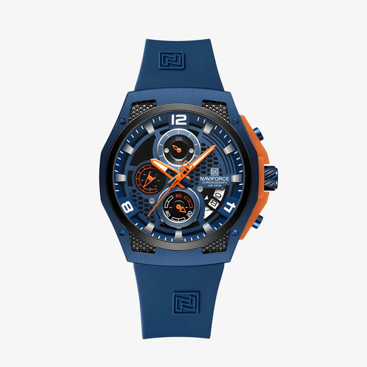 Naviforce NF8051T u plavoj boji sa narandžastim detaljima je savršen sat za moderne muškarce, entuzijaste ili one koji žele da budu primećeni bez preterivanja.