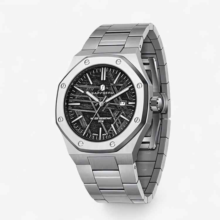 SAPPHERO SO2110 nudi spoj modernog dizajna i poslovne elegancije. Srebrno kućište od nerđajućeg čelika u kombinaciji sa crnim “meteor” brojčanikom stvara upečatljiv kontrast i daje satu jedinstvenu teksturu i prepoznatljiv izgled.
