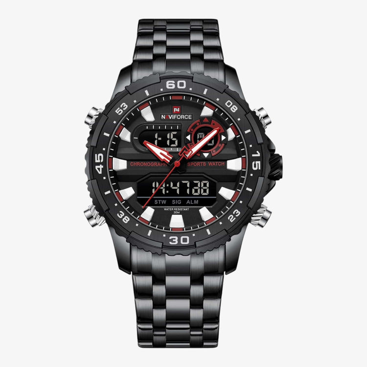 Naviforce NF9234 je muški sat sa digitalnim i analognim prikazom vremena, izrađen za one koji traže snagu, funkcionalnost i upečatljiv dizajn u jednom modelu. Masivno kućište i metalna narukvica u crnoj boji, upotpunjeni crvenim detaljima na ciferu, odaju sportski karakter i snažan vizuelni kontrast. Ovo nije samo dodatak – to je sat koji se vidi, oseća i pamti.