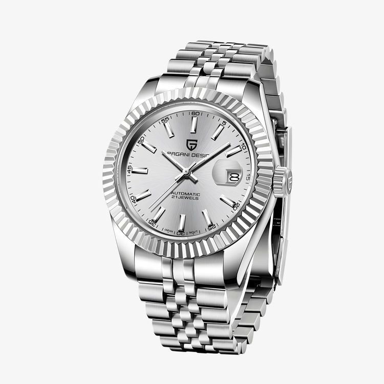 Pagani Design PD1645 je muški automatik sat sa Seiko NH35 mehanizmom, poznatim po pouzdanosti, preciznosti i dugotrajnom radu. U kombinaciji sa srebrnim kućištem od nerđajućeg čelika, svetlim brojčanikom i čeličnom jubilee narukvicom, ovaj model donosi čist, sofisticiran i uravnotežen izgled pogodan za poslovni stil.