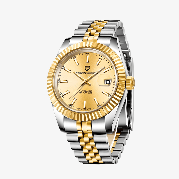 Pagani Design PD1645 je muški automatik sat sa Seiko NH35 mehanizmom, poznatim po pouzdanosti, preciznosti i dugotrajnom radu. U kombinaciji sa zlatnim brojčanikom i čeličnom jubilee narukvicom sa zlatnim i srebrnim karikama, ovaj model donosi luksuzan i upečatljiv izgled koji odmah privlači pažnju.