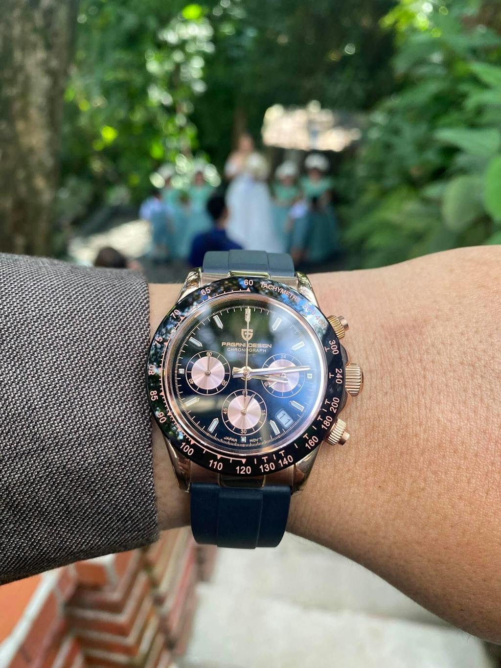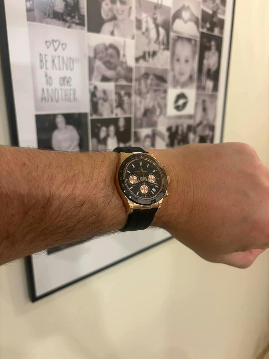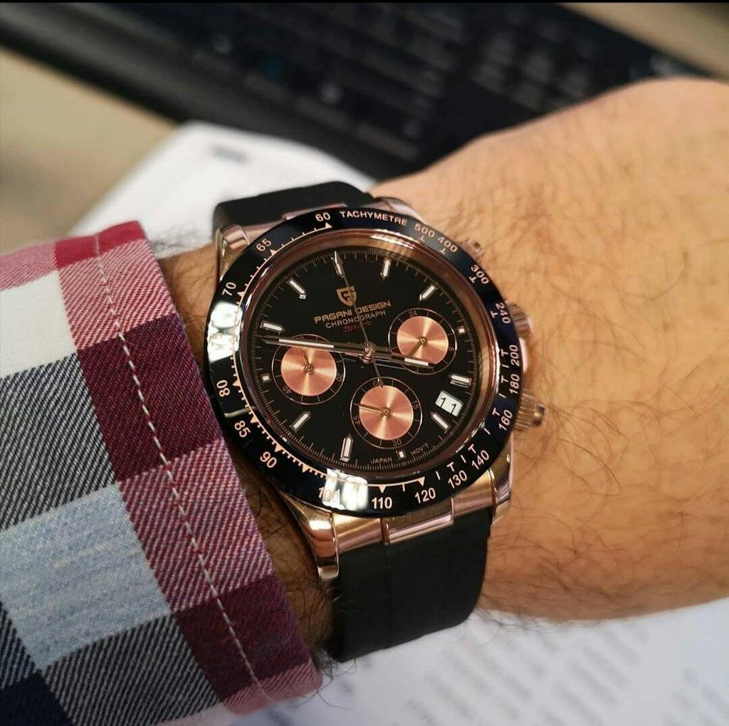 Pagani Design PD1664 Daytona – izbor za muškarce koji žele sat koji privlači pažnju na prvi pogled i nudi besprekornu funkcionalnost. Kućište u toploj rose gold nijansi, upareno sa crnom bojom, donosi spoj luksuza i sportskog karaktera koji se ističe u svakoj prilici.