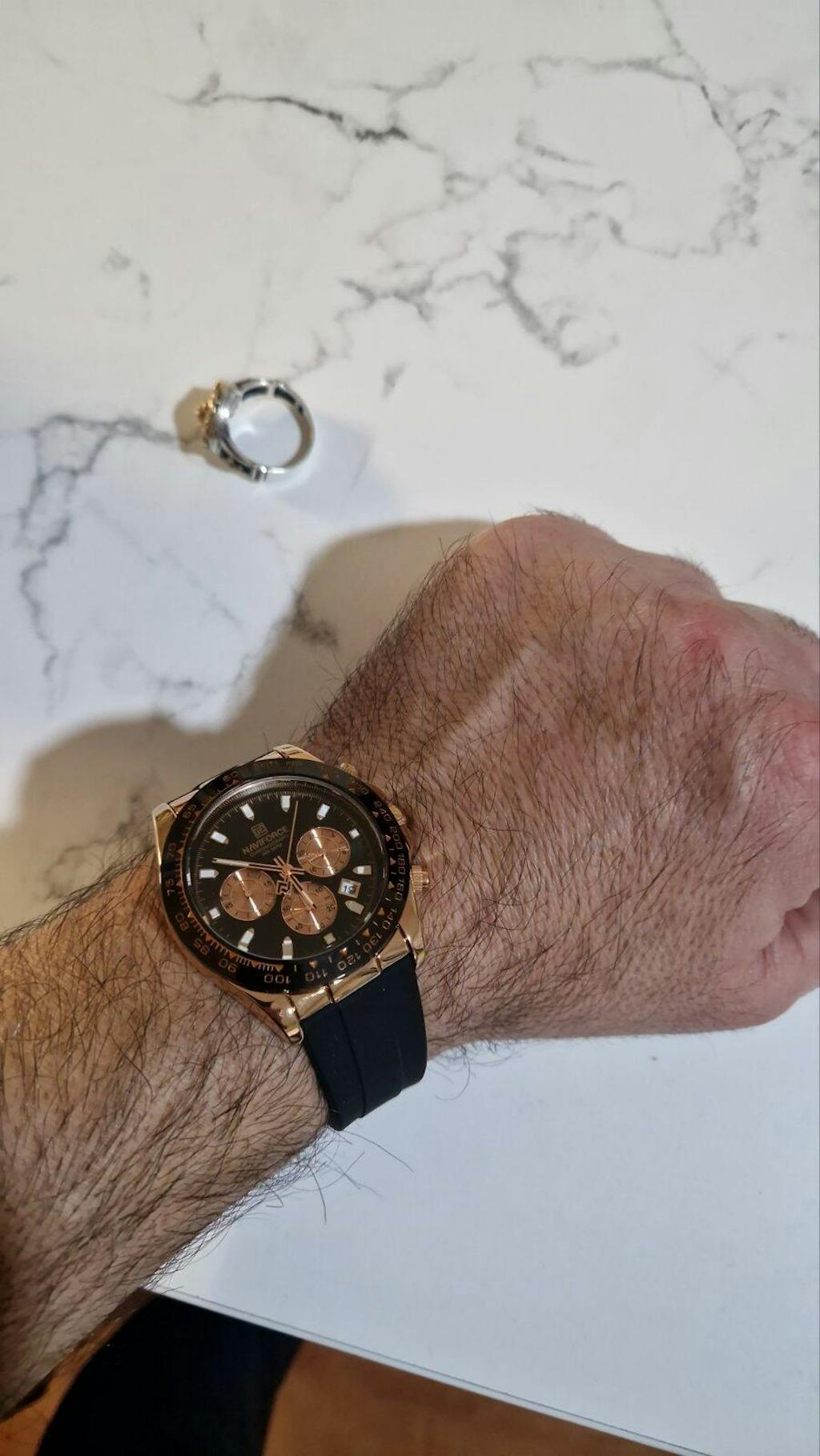 ✅ Kućište od nerđajućeg 316L čelika dimenzija 40 mm x 12 mm, pruža osećaj čvrstine i premium kvaliteta. Brojčanik i korona u crnoj boji sa hronografima u rose gold nijansi stvara upečatljiv i sofisticiran izgled, dok silikonska narukvica dodaje sportsku notu i izuzetnu udobnost pri nošenju.