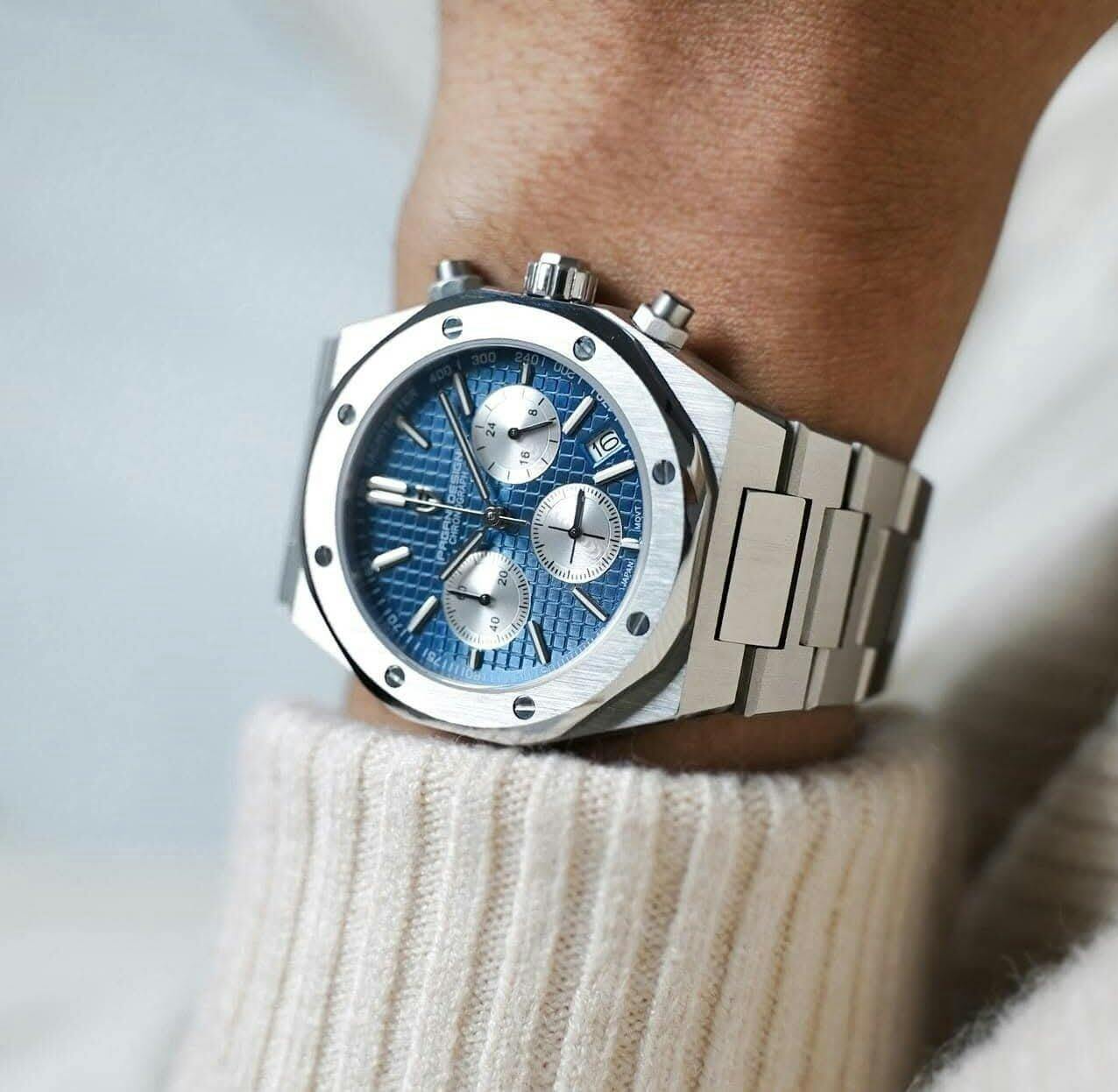 ✅ Plavi brojčanik sa reljefnim „tapisserie“ kockicama daje dubinu i moderan izgled. Hronografski podbrojčanici su jasno uokvireni, a markeri i kazaljke sa luminacijom obezbeđuju odličnu čitljivost i danju i noću.