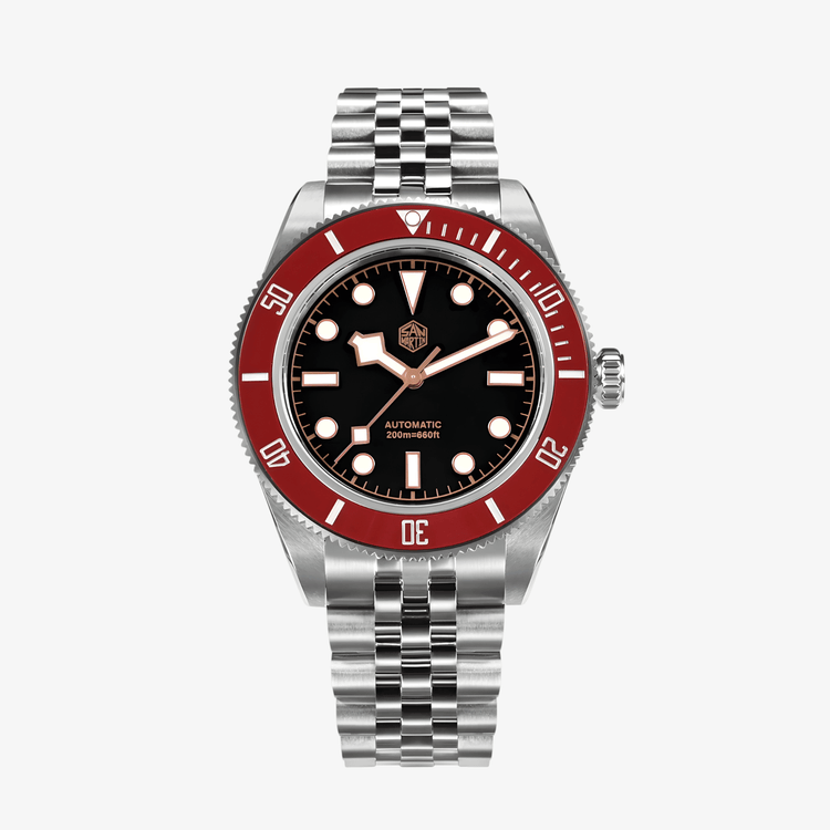 San Martin SN0128 predstavlja savršen balans između klasične forme i modernih detalja. Crni brojčanik u kontrastu sa crvenom koronom donosi upečatljiv izgled, dok Jubilee narukvica dodaje prepoznatljiv retro šarm i udobnost. Ovaj model spaja preciznost, trajnost i dizajn koji nikada ne izlazi iz mode.