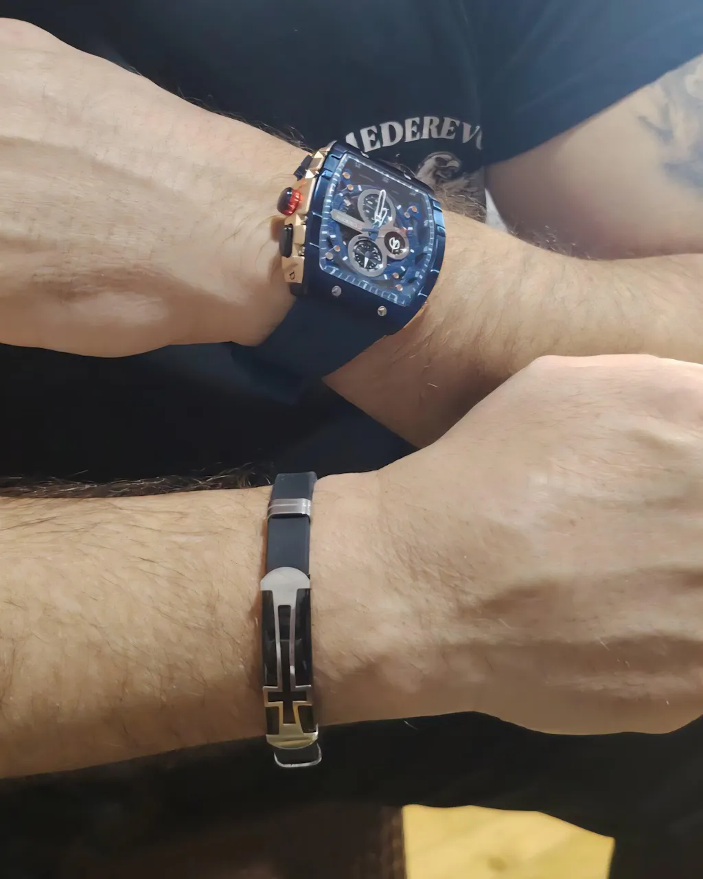 ✅ Silikonski kaiš u tamnoplavoj boji prijatno naleže na ruku, otporan je na vlagu i udoban za celodnevno nošenje. U kombinaciji sa metalnim detaljima zaokružuje sportski, ali ozbiljan vizuelni identitet sata.