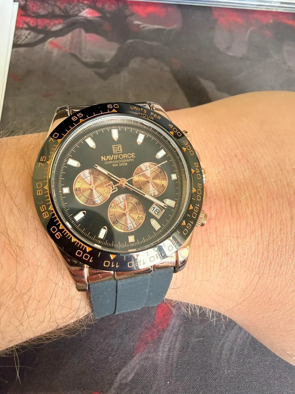 ✅ Brojčanik pruža elegantan kontrast i odličnu preglednost. Tamna osnova ističe markere i kazaljke u rose-gold tonu, dok podbrojčanici ostaju jasno čitljivi i lepo uklopljeni u dizajn.