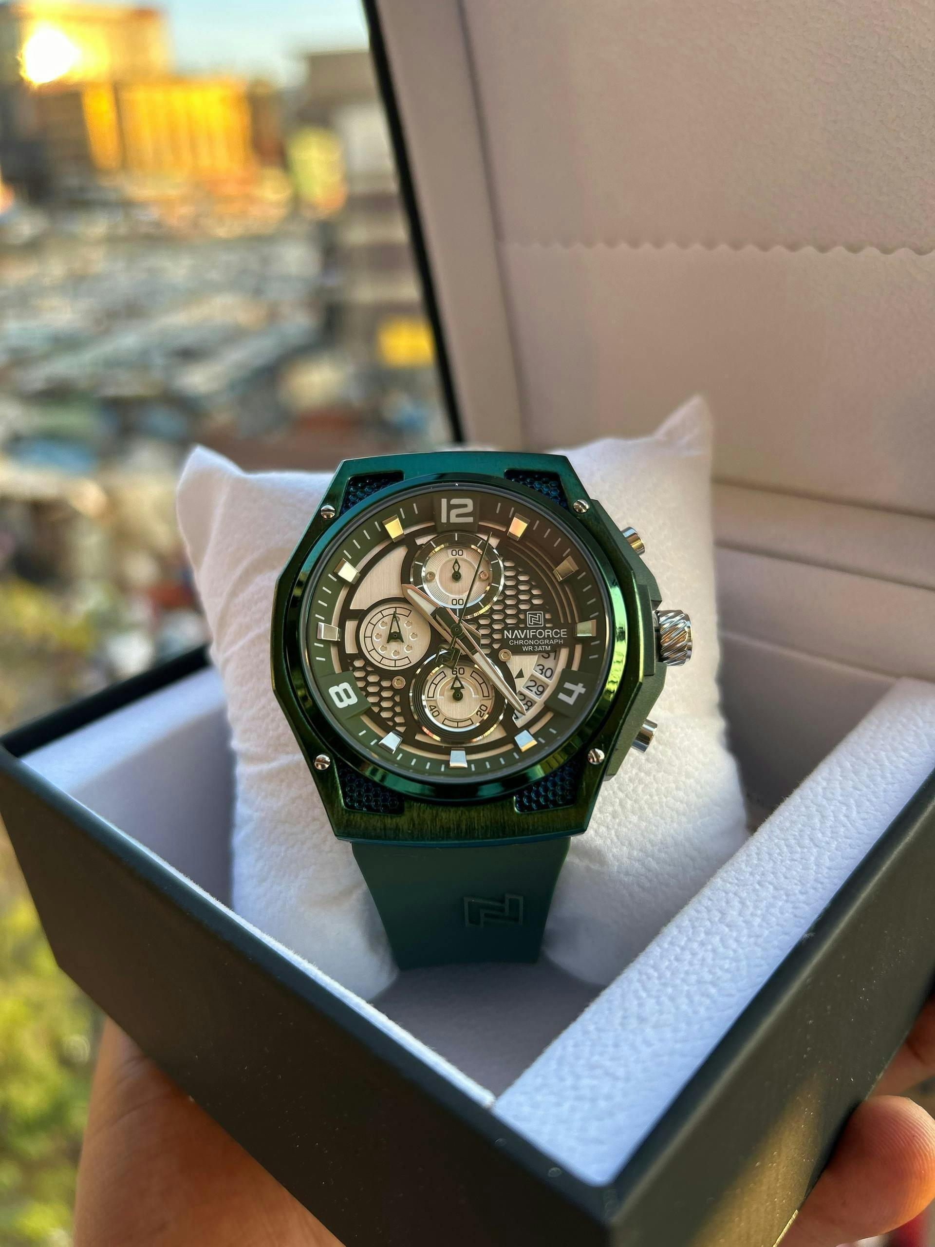 Model Naviforce NF7123 pripada Kolekciji NF7123, dostupnoj u više varijanti boja i detalja. Zelena verzija sa srebrnim akcentima posebno se ističe svežinom i originalnošću.