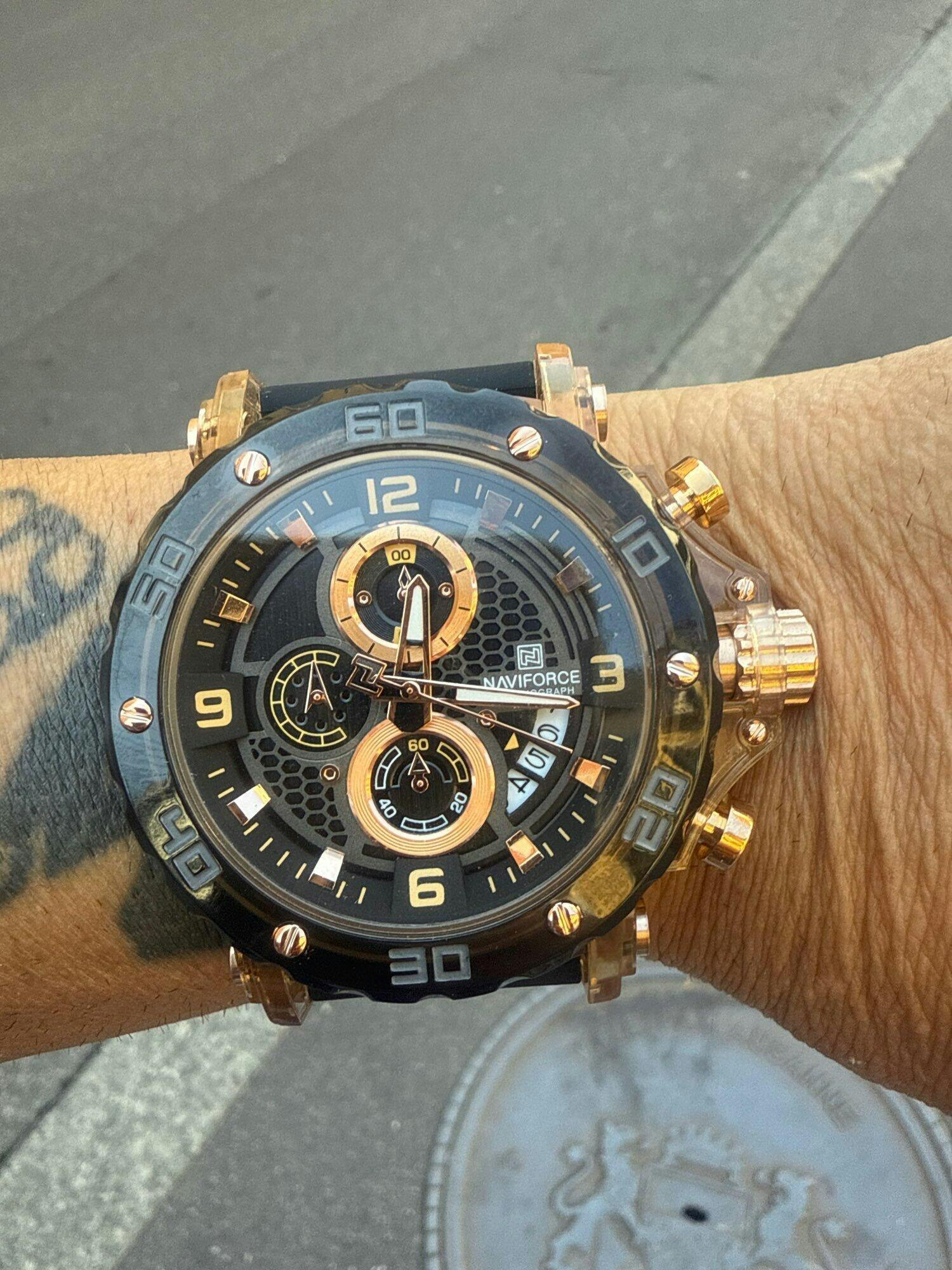 Naviforce NF7123 u crno-rose gold kombinaciji namenjen je muškarcima koji žele sat sa snažnim vizuelnim identitetom i sportskim karakterom. Idealan je za one koji cene upečatljiv izgled, ali i traže praktičnost i pouzdanost u svakodnevnom korišćenju.