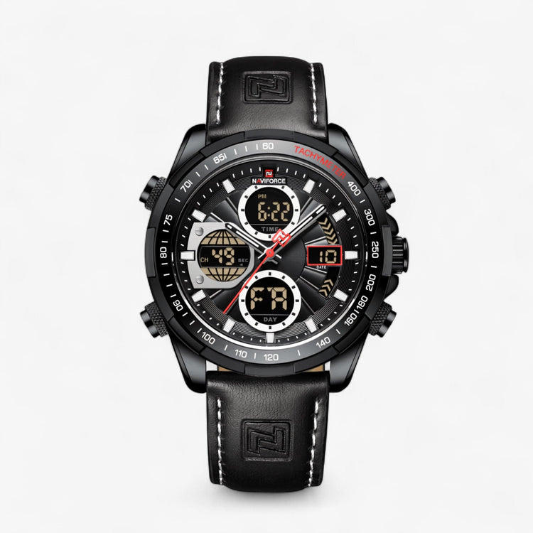 Naviforce NF9197 u crnoj boji donosi taktički izgled u kombinaciji sa funkcijama koje olakšavaju svakodnevni tempo. Dizajniran za muškarce koji žele sat sa stavom – precizan, pouzdan i vizuelno snažan. Digitalno-analogni prikaz, crna kožna narukvica i izraženi kontrasti na brojčaniku čine ovaj model praktičnim saputnikom u svim uslovima – od kancelarije do terena.