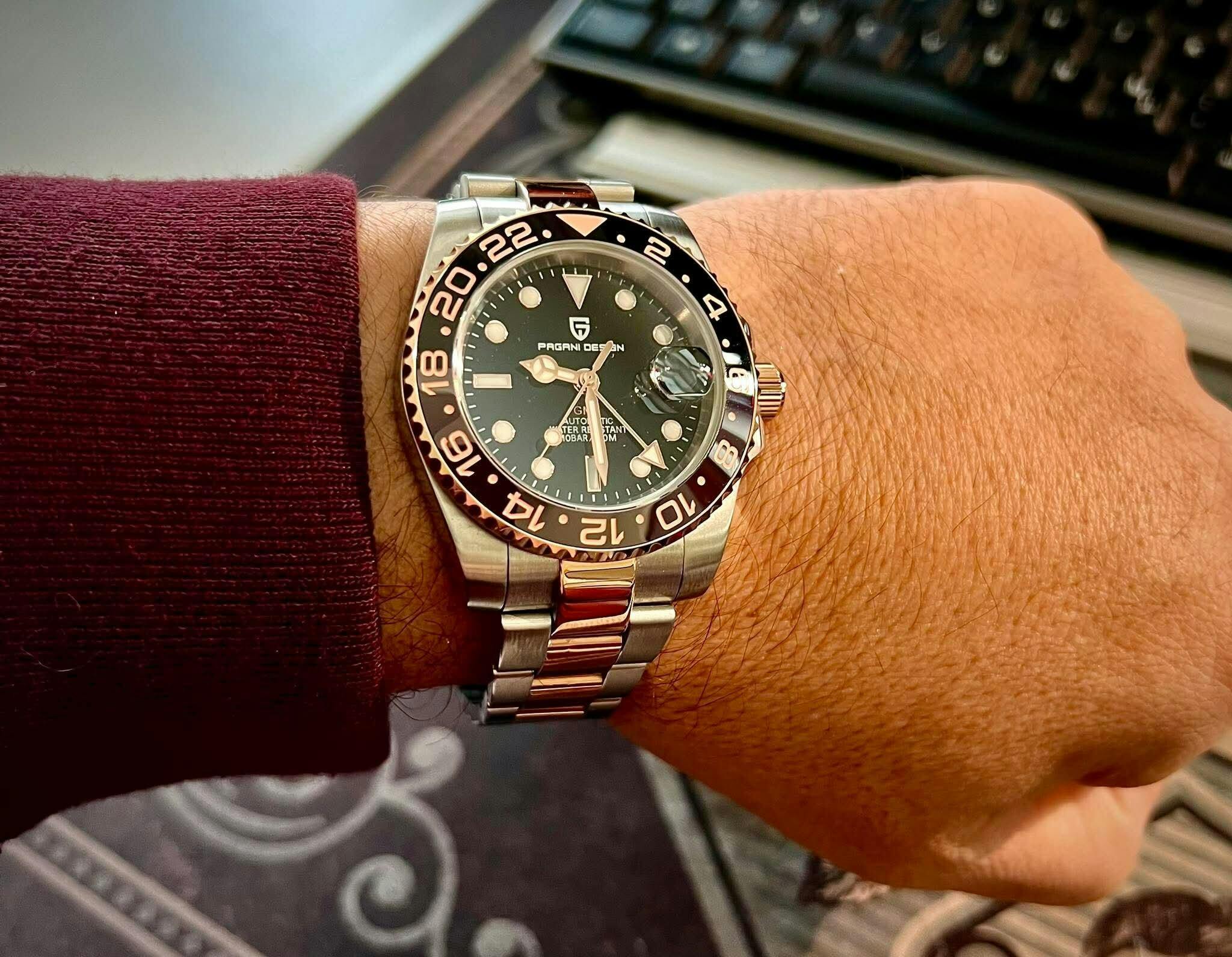 Pagani Design PD-1662, poznat kao“Rose Gold”, je automatski muški sat sa GMT funkcijom za praćenje dve vremenske zone. Idealan je za putovanja ili posao sa inostranstvom. Rose gold kućište i crni detalji daju mu stil koji se uklapa u svaki outfit – i poslovni i opušteni.