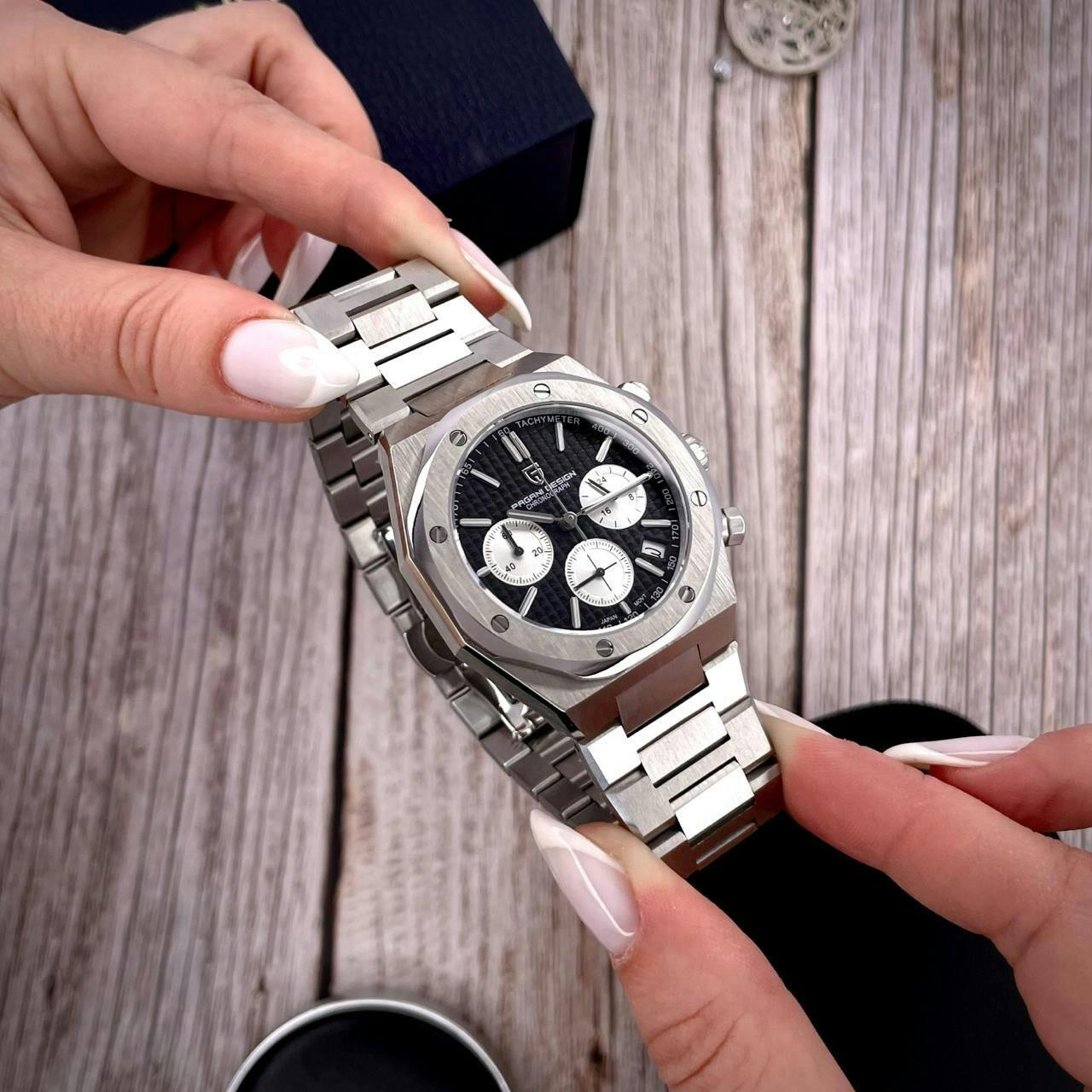 Pagani Design PD1707 donosi spoj sportskog duha i sofisticiranog dizajna. Srebrna narukvica od čelika u kombinaciji sa crnim brojčanikom pruža snažan vizuelni kontrast i upečatljiv izgled na ruci.