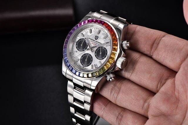 Pagani Design PD1664 Daytona Rainbow – stvoren za muškarce koji žele da unesu dozu hrabrosti u svoj stil. Korona u duginim bojama odmah privlači pogled, dok beli brojčanik sa Meteorite pattern teksturom pruža luksuzan i jedinstven vizuelni doživljaj.