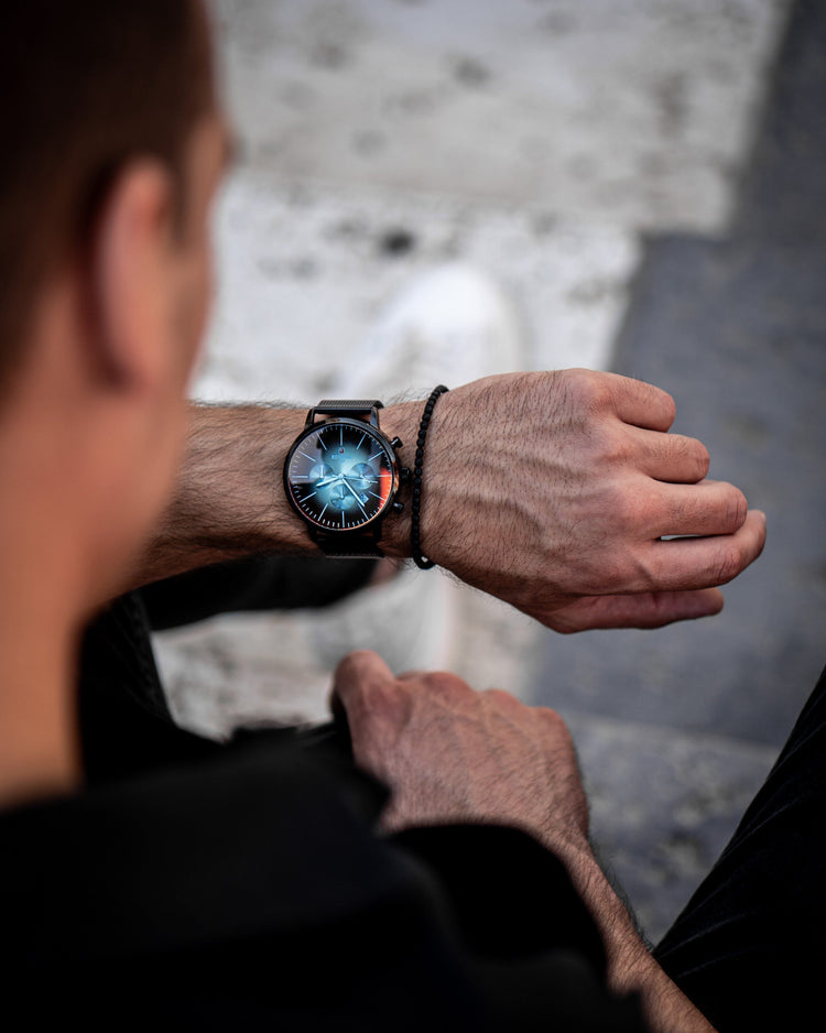 Kućište ovog modela izrađeno je od visokokvalitetnog nerđajućeg čelika sa preciznom završnom obradom koja pruža efekat luksuza već na prvi pogled. Crna boja u kombinaciji sa sjajnim metalnim detaljima daje snažan, poslovan izgled. Pletena metalna narukvica elegantnog i diskretnog dizajna savršeno prijanja uz zglob i pruža udobnost tokom celodnevnog nošenja – bez osećaja težine ili nelagodnosti.