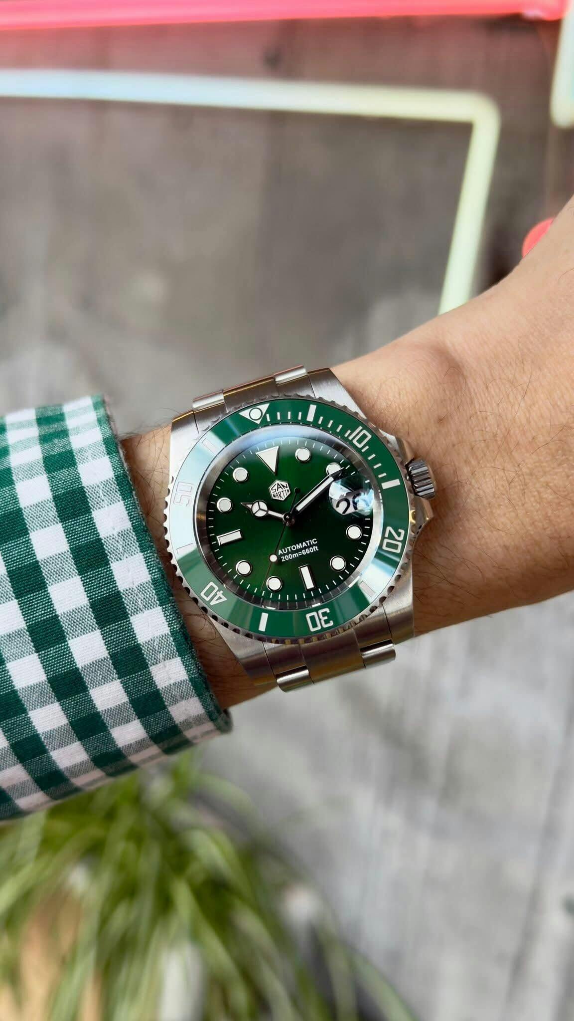 San Martin SN0017 je model za muškarce koji žele sat koji se ističe bojom i kvalitetom. Duboka zelena korona u spoju sa zelenim brojčanikom pruža upečatljiv, ali uravnotežen izgled koji podseća na prestižne diver modele. Naglasak je na funkcionalnosti, izdržljivosti i preciznom automatskom mehanizmu.
