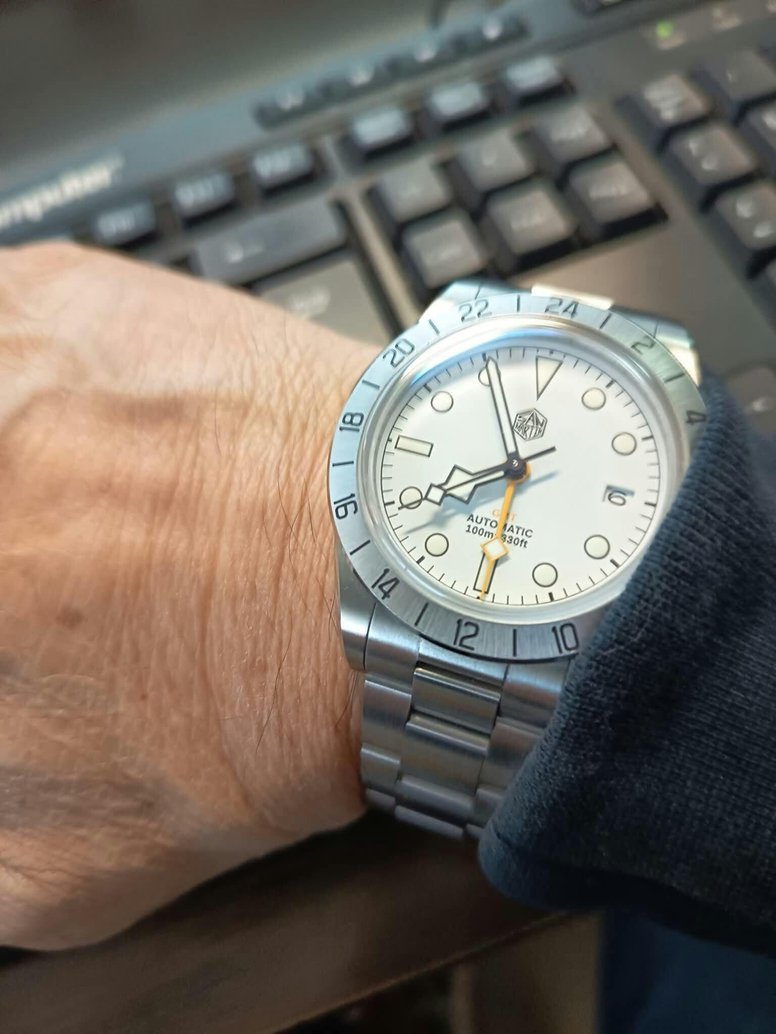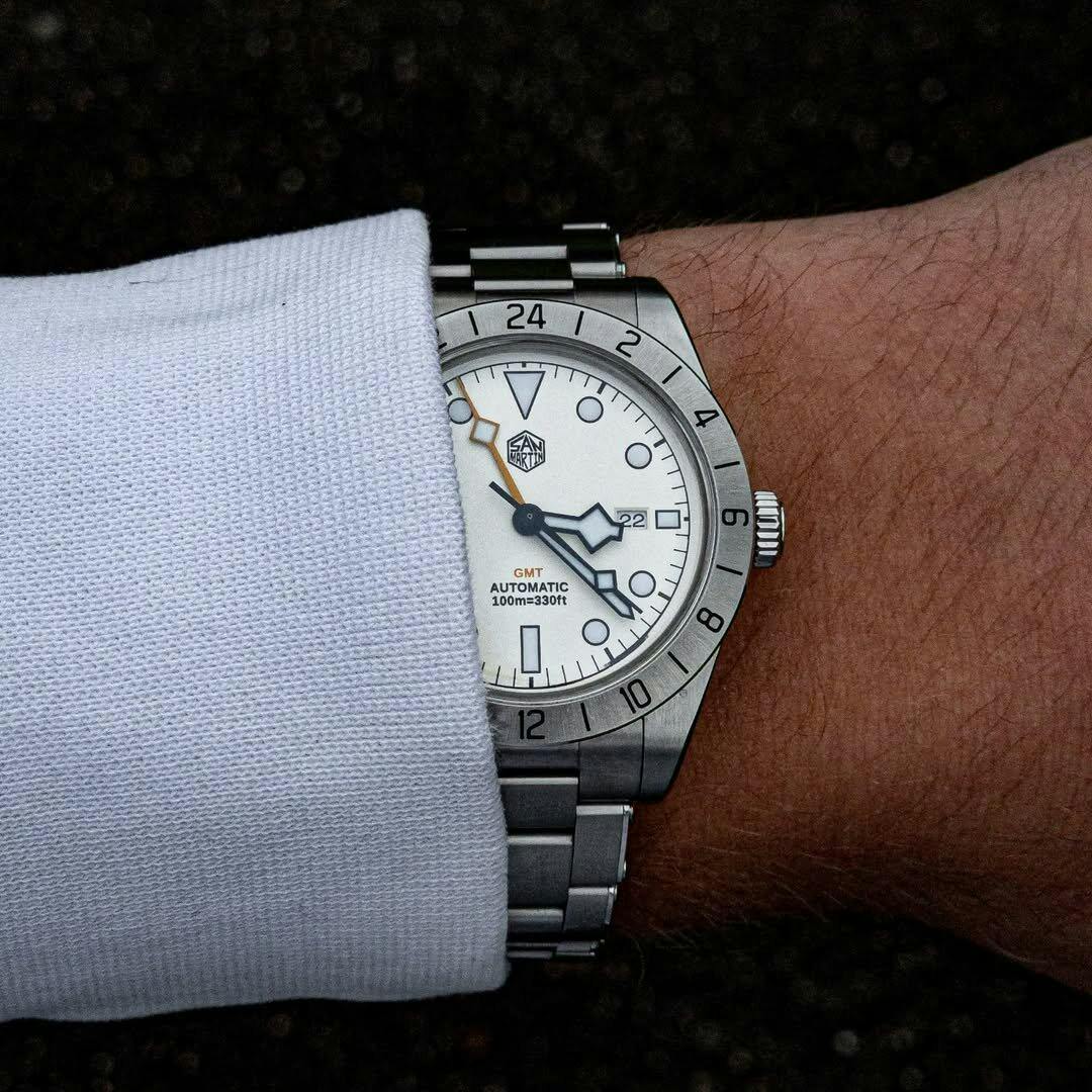 San Martin SN0054 je muški sat sa belim „Polar“ brojčanikom i GMT funkcijom za one koji žele praktičnost, preciznost i čist dizajn. Čelični 24-časovni bezel i jasni markeri daju odličnu preglednost, dok automatski mehanizam obezbeđuje pouzdan rad bez baterije. Minimalno, korisno i izrađeno da traje.