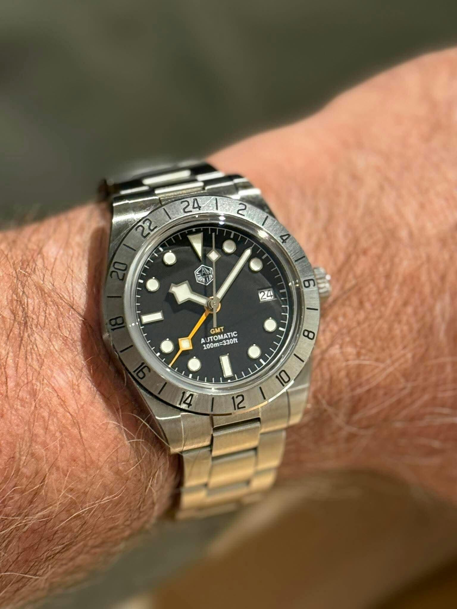 ✅ Crni brojčanik sa kontrastnim markerima donosi besprekoran izgled i odličnu čitljivost. GMT skala na bezelu omogućava lako praćenje drugog vremenskog pojasa, što ga čini praktičnim za putnike i poslovne ljude.