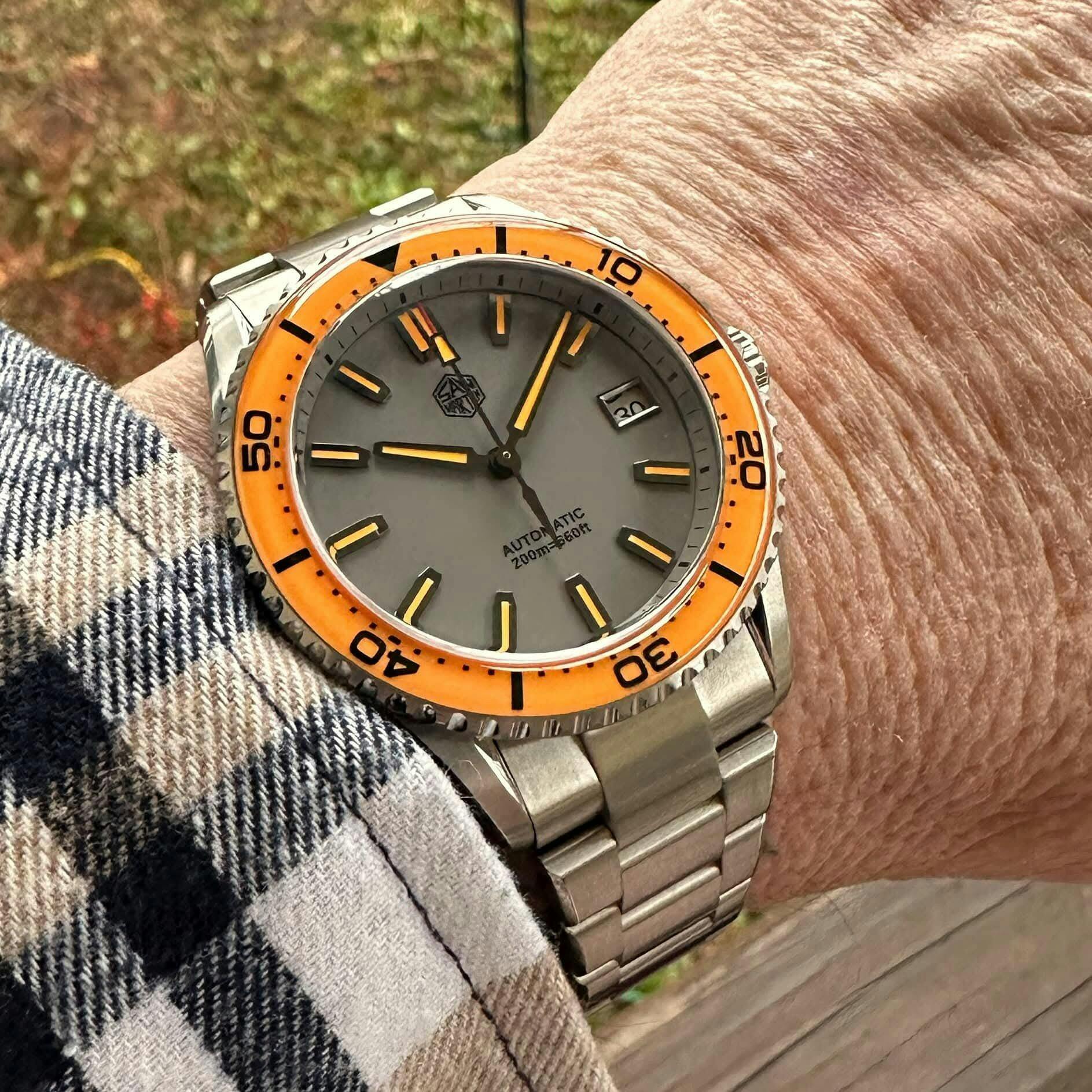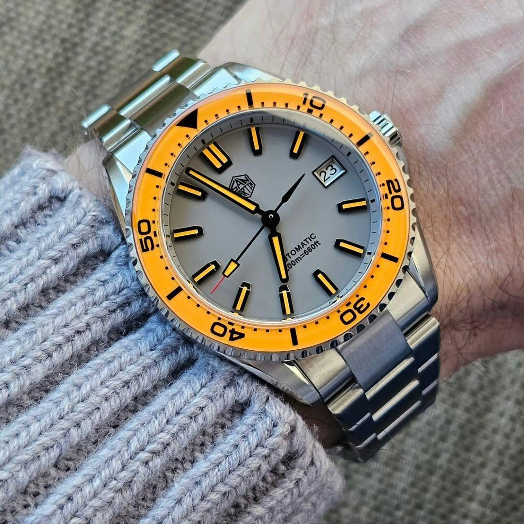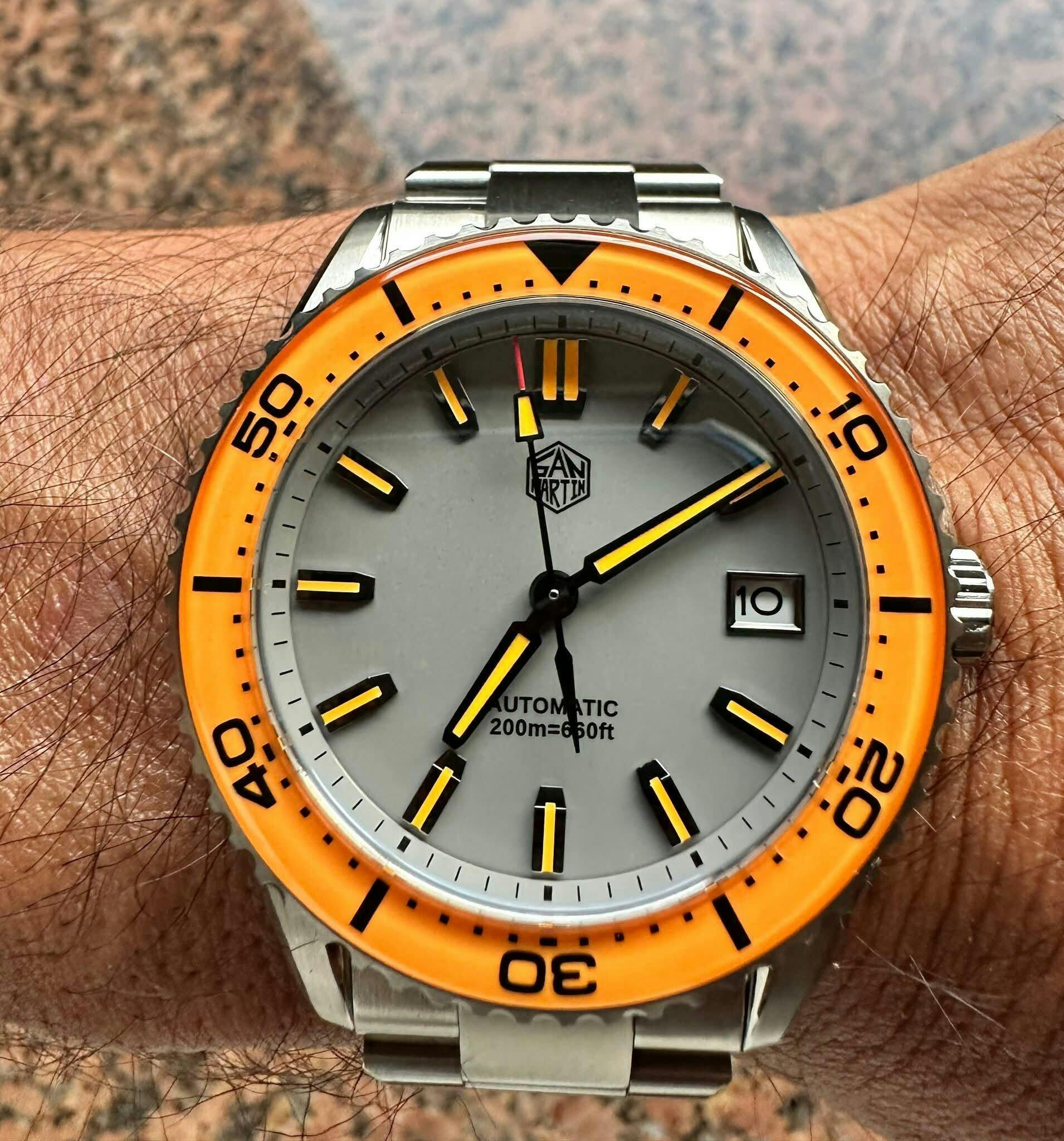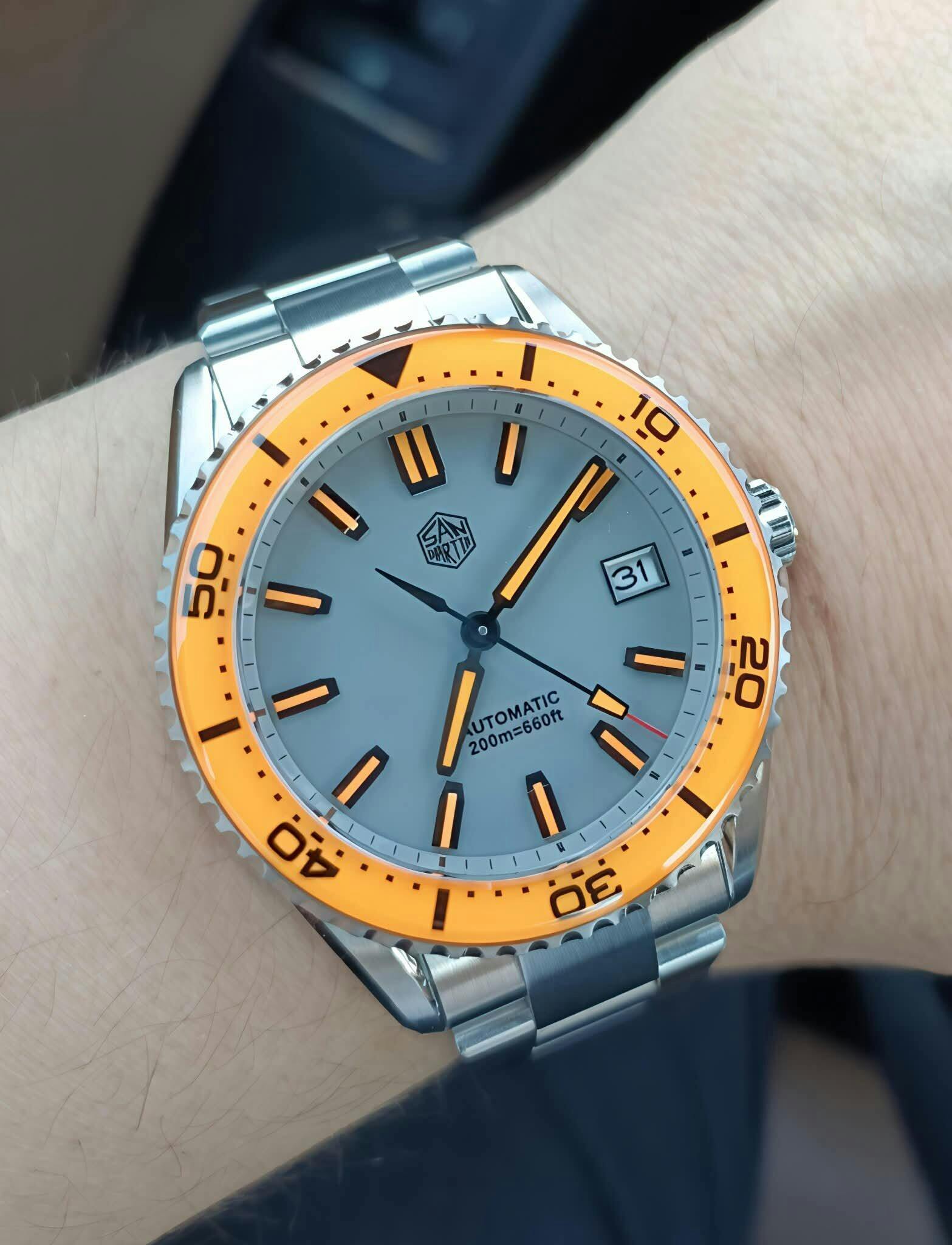 San Martin SN0129 je izbor za muškarce koji cene preciznost, kvalitetnu izradu i dizajn koji se izdvaja iz mase. Narandžasti bezel u kombinaciji sa sivim brojčanikom daje ovom modelu prepoznatljiv i moderan karakter, spajajući eleganciju i sportski duh u jednom satu.