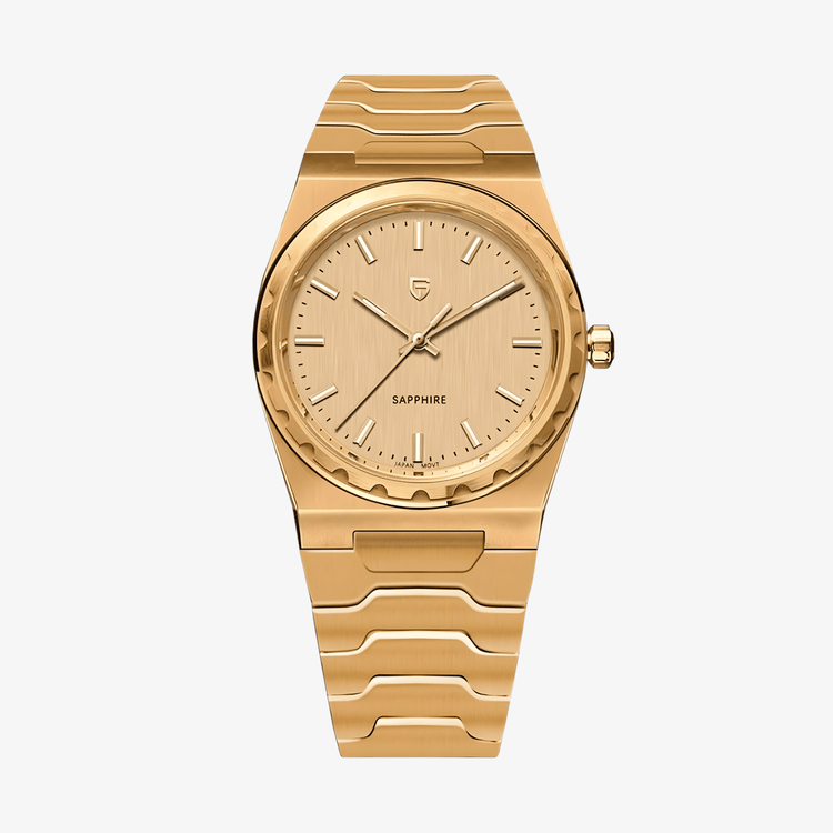 ✅ Kućište i narukvica izrađeni su od 316L nerđajućeg čelika sa trajnim zlatnim PVD premazom. Ne bledi, ne puca i ne menja boju čak ni posle višemesečnog svakodnevnog nošenja.