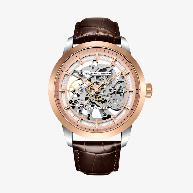 Pagani Design PD1638 je sat namenjen muškarcima koji žele spoj klasičnog skeleton dizajna i pouzdanog automatskog mehanizma. Beli skeleton brojčanik uparen sa zlatnim čeličnim kućištem i braon kožnom narukvicom daje ovom modelu luksuzan i prepoznatljiv izgled.