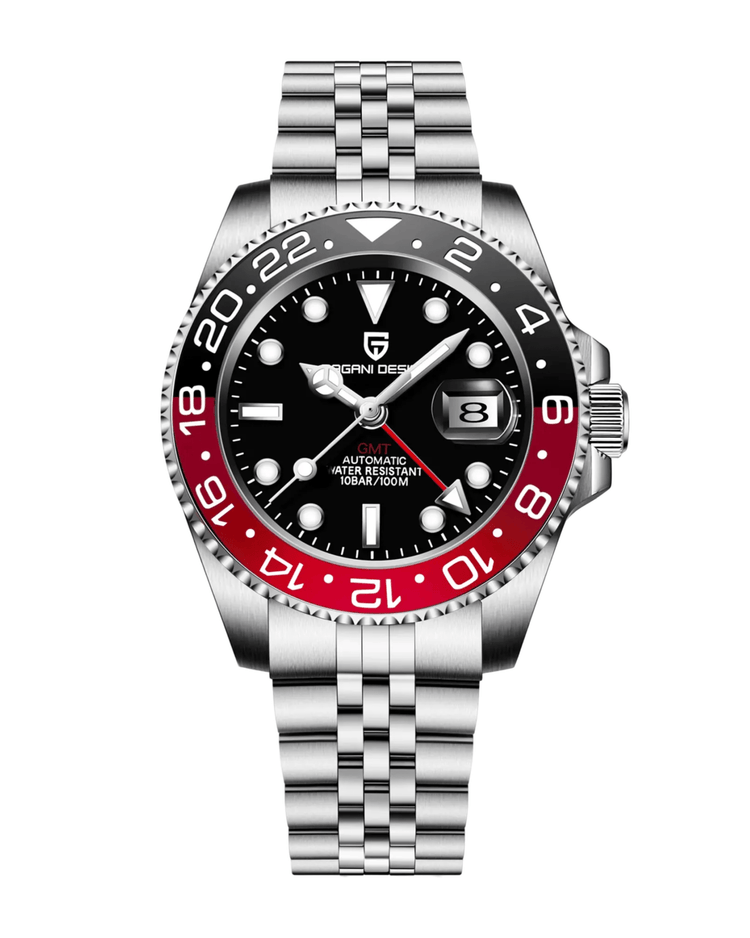 Inspirisan legendarnim Rolex GMT Master modelom iz 1954. godine, PD-1662 u crno-crvenoj verziji donosi prepoznatljiv dizajn koji je decenijama simbol prestiža – sada i po znatno pristupačnijoj ceni. Nudi moćan vizuelni utisak uz pouzdanost SEIKO TMI NH35 automatskog mehanizma, poznatog po preciznosti, tihom radu i mogućnosti ručnog navijanja.