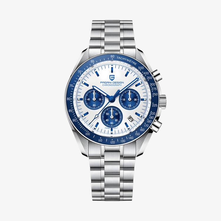 Pagani Design PD-1701 u srebrnoj varijanti sa plavim bezelom i hronografima donosi klasičan izgled inspirisan legendarnim Speedmaster modelom. Kombinacija čeličnog kućišta, tamnoplavih detalja i Seiko mehanizma daje ovom satu prepoznatljiv sportsko-urbani karakter.