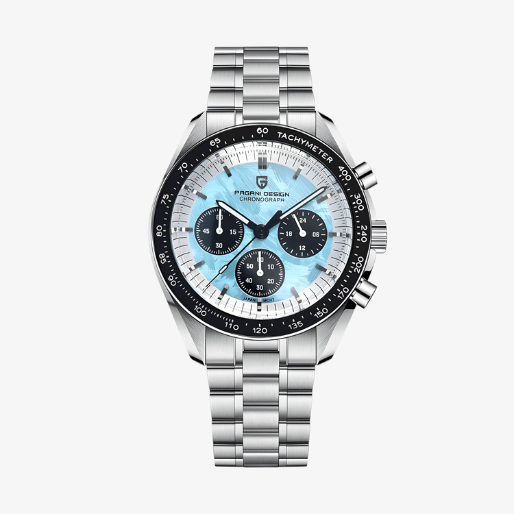 Pagani Design PD-1701 Blue Panda je izbor za muškarce koji vole klasičan hronograf sa savremenim akcentima. Plavi brojčanik u kombinaciji sa crnim hronografima i preciznim Seiko mehanizmom donosi prepoznatljiv izgled i pouzdan rad u svakodnevnim uslovima.