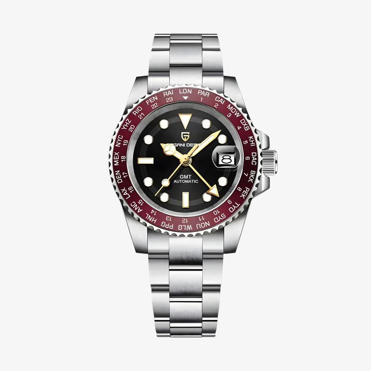 Pagani Design PD1758 Red GMT Master je model stvoren za muškarce kojima je potreban pouzdan automatik sa GMT funkcijom. Namenjen je onima koji često putuju ili žele praktičan sat koji kombinuje sportsku energiju i svakodnevnu upotrebljivost.