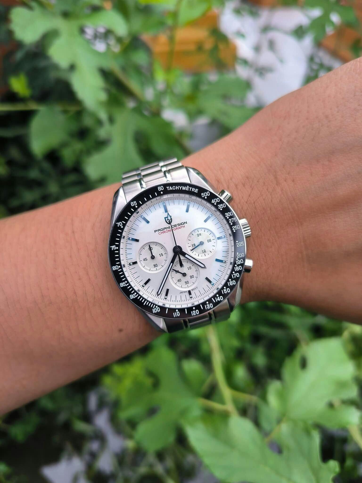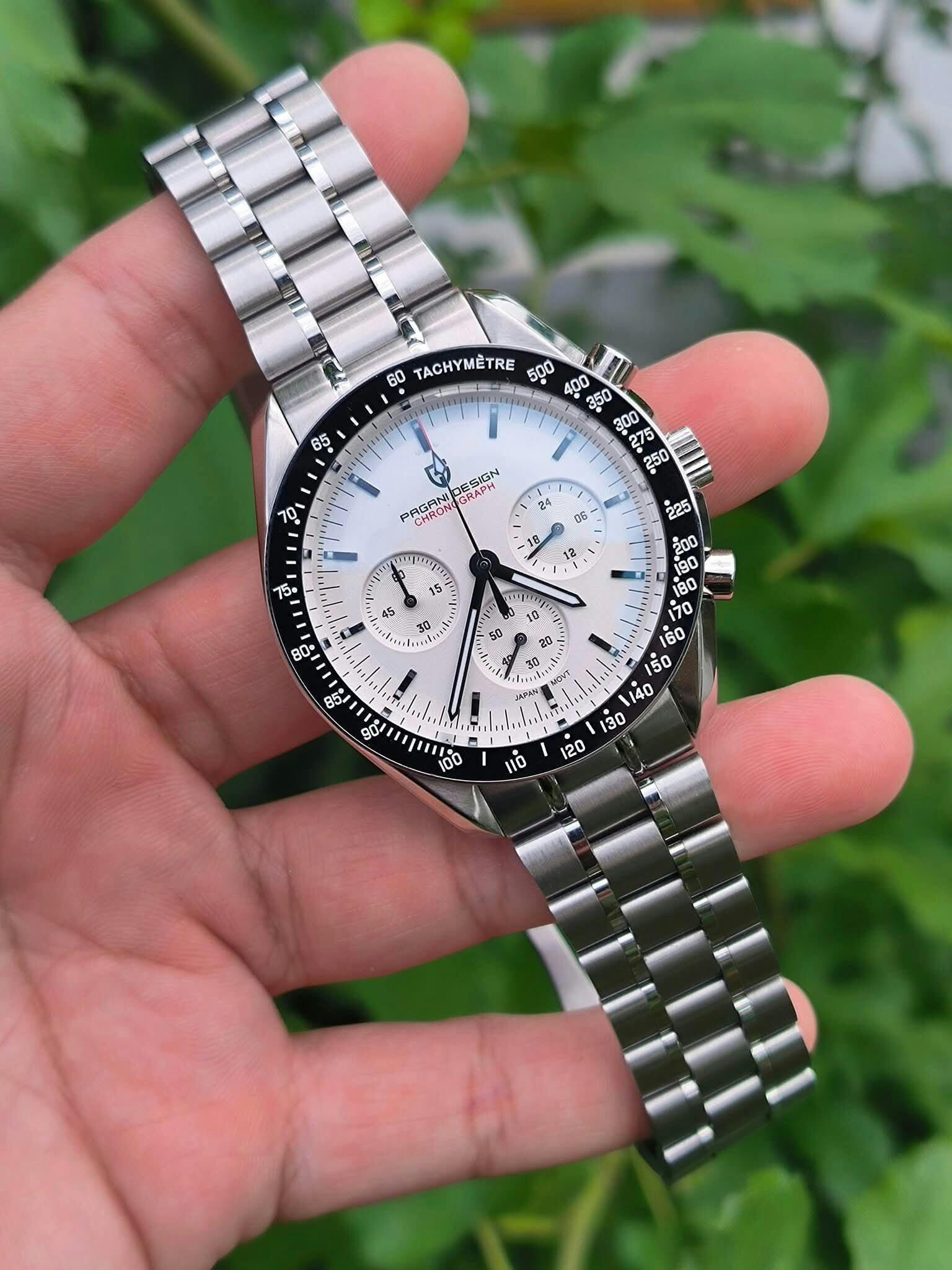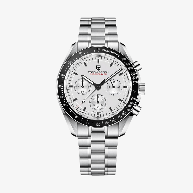 Ovaj model je deo Pagani Design PD1701 kolekcije, inspirisane legendarnim Speedmaster satovima. Beli brojčanik sa crnim bezelem pruža upečatljiv kontrast, a kolekcija nudi i druge varijante boja i narukvica kako biste pronašli sat koji najbolje izražava Vaš stil.