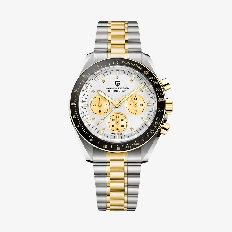 Pagani Design PD-1701 u srebrno-zlatnoj kombinaciji spaja klasičan sportski dizajn sa luksuznim detaljima. Sat inspiriše na legendarni Speedmaster stil, dok zlatni akcenti na kućištu i narukvici dodaju dozu prefinjenosti i elegancije.