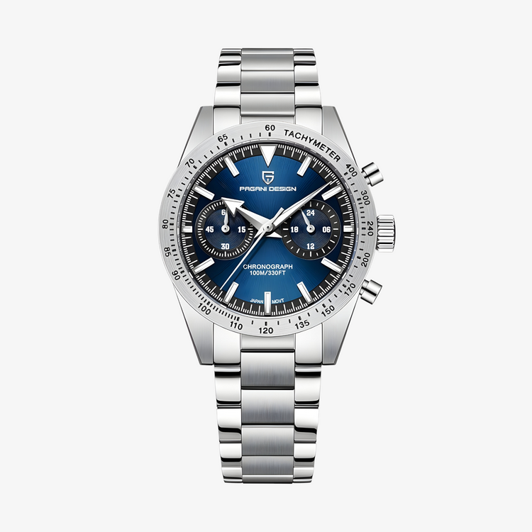 Pagani Design PD1766 Ocean Blue namenjen je muškarcima koji žele sat koji spaja sportsku dinamiku i profinjen izgled. Plavi brojčanik u kombinaciji sa srebrnim kućištem i čeličnom narukvicom donosi osvežavajući i upečatljiv karakter, idealan i za poslovni i za svakodnevni stil.
