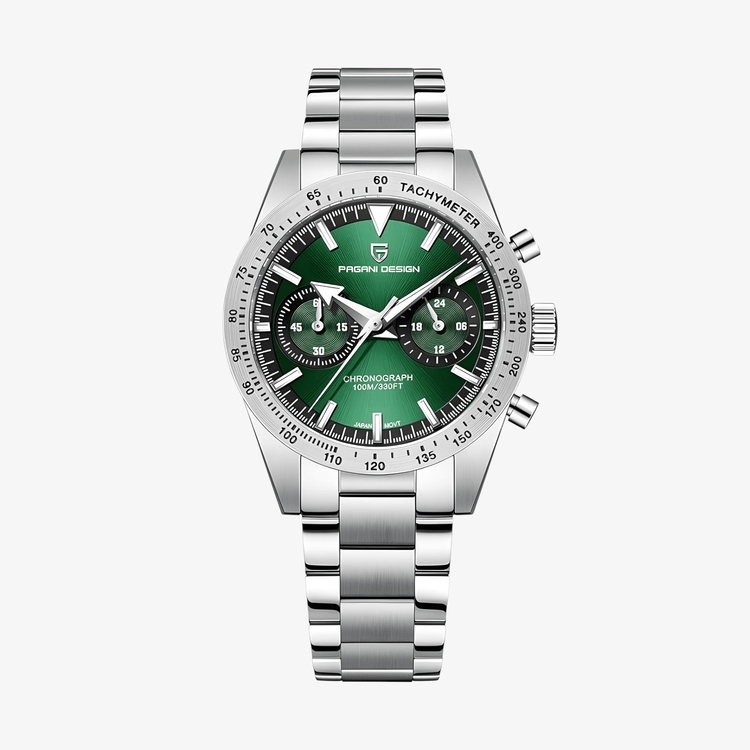 Pagani Design satovi prepoznatljivi su po pouzdanim japanskim mehanizmima, 316L čeliku i safirnom staklu. Model PD1766 u zelenoj boji donosi svež, moderan karakter uz praktičnu funkcionalnost. Dostupan je i u plavoj boji.