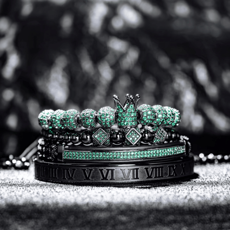 Royal Smaragd set spaja četiri različita dizajna u skladnu celinu. Laboratorijski smaragdni kristali daju snažan akcenat, dok tamna baza obezbeđuje uredan, premium utisak u svakoj prilici.