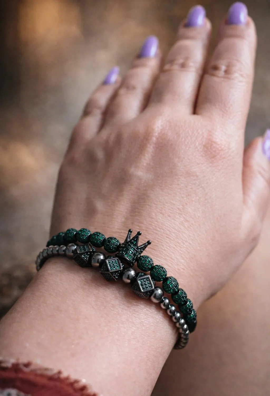 Set sadrži četiri različite crne narukvice sa zelenim kristalima — od minimalističkih do izraženijih komada. Nosite sve zajedno za slojevit „statement“ izgled, ili birajte 1–2 komada uz sat za suptilniji stil. Jedna kupovina, više kombinacija za posao, izlazak i trening.